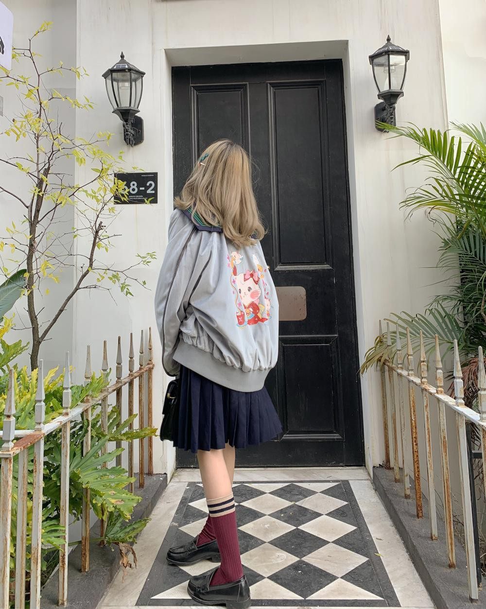 Elim 原創自制絲絨飛行夾克印花昭和和服貓咪中性日系不良jk
